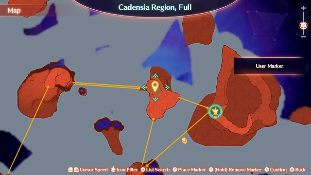 Para chegar na parte central dessa ilha é necessário descer pela corda (linha amarela) mostrada no mapa. Em seguida pode-se contornar a plataforma elevada no centro pela direita, entrando em uma pequena caverna e passando pelo ponto de teletransporte "Fifth Pillar Remant". Dali de cima será possível pular na plataforma elevada e chegar no local onde o anel está.
